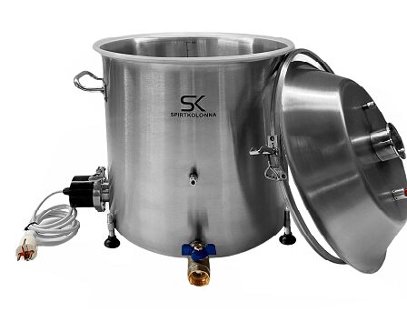 Specializēta profesionāla destilācijas tvertne ar pilnībā noņemamu vāku, kas aprīkota ar nerūsējošā tērauda skavu-fiksatoru (skavas savienojuma veids), izgatavota no pārtikas kvalitātes nemagnētiska nerūsējošā tērauda AISI-304.